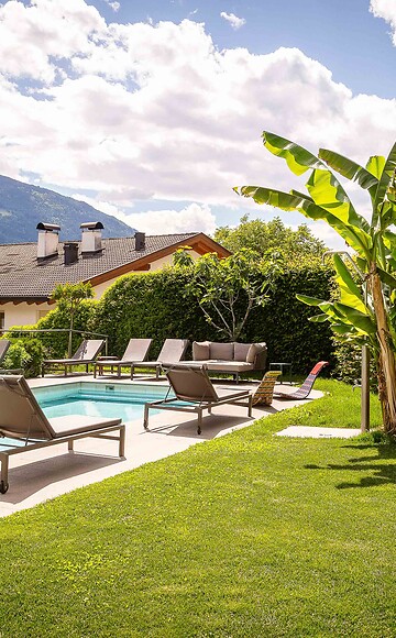 For those who do not want to miss out on a traditional pool, our outdoor swimming pool is available. Swim your lengths and afterwards relax on the well-maintained lawn with sun umbrellas, high-quality loungers and a fantastic view of the mountains around the Merano basin. The water temperature is consistently at 28 degrees - the pool is heated in spring and autumn.